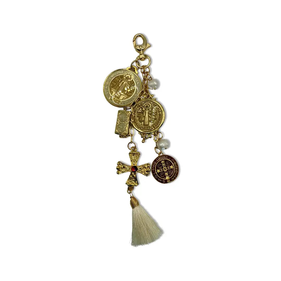 Llavero de San Benito con medallas encapsuladas y chapa de oro importada con cruz y cristal + mota.